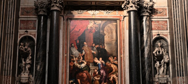 Viste del transetto11 Immagini La cappella dedicata a Sant'Ignazio di Loyola Sopra l'Altare, lo stemma con il motto gesuita "Ad maiorem Dei gloriam" ai lati, Abramo e Davide, esempi di fede nell'Antico Testamento Abramo e Isacco (Bernardo Falcone, 1650 circa) Sant'Ignazio guarisce un'ossessa, capolavoro realizzato da P.P. Rubens nel 1620 su commissione di Niccolò PallavicinoSant'Ignazio guarisce un'ossessa (Rebens, 1615 circa, commissionato da Niccolò Pallavicino David con la testa di Golia (Bernardo Falcone, 1650 circa) Alla base dell'altare gli stemmi delle famiglie Rebuffo e Carrega che iniziarono a finanziare questa cappella particolare di un candelabro cappella di San Giovanni Battistacappella di Santo Stefano