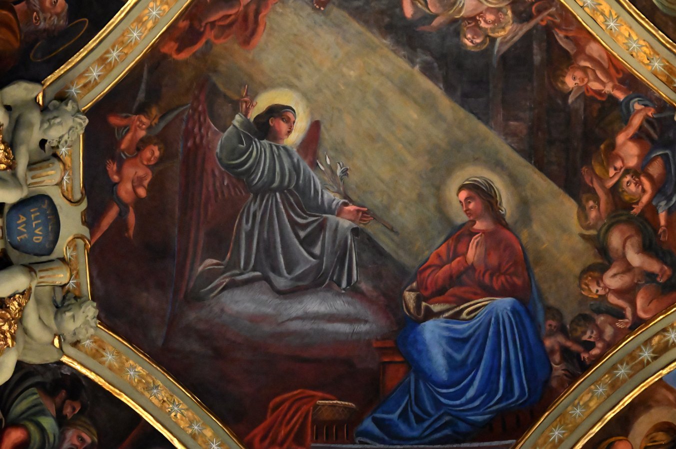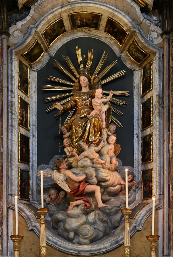 Altare di N.S. del Rosario Affreschi di Giovanni Quinzio Annunciazione, affresco sulla volta della cappella di Giovanni Quinzio Altare di N.S. del Rosario Madonna del Rosario, statua lignea di Giovanni Battista Santacroce (XVII sec.) Madonna del Rosario, statua lignea di Giovanni Battista Santacroce (XVII sec.) arco affrescato e particolari sovrastanti l'altare Altare di San LorenzoAltare di s.Rita da Cascia