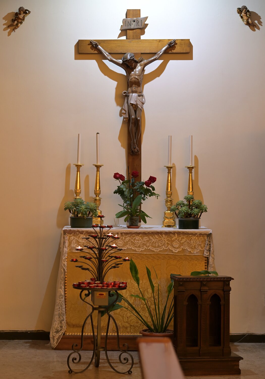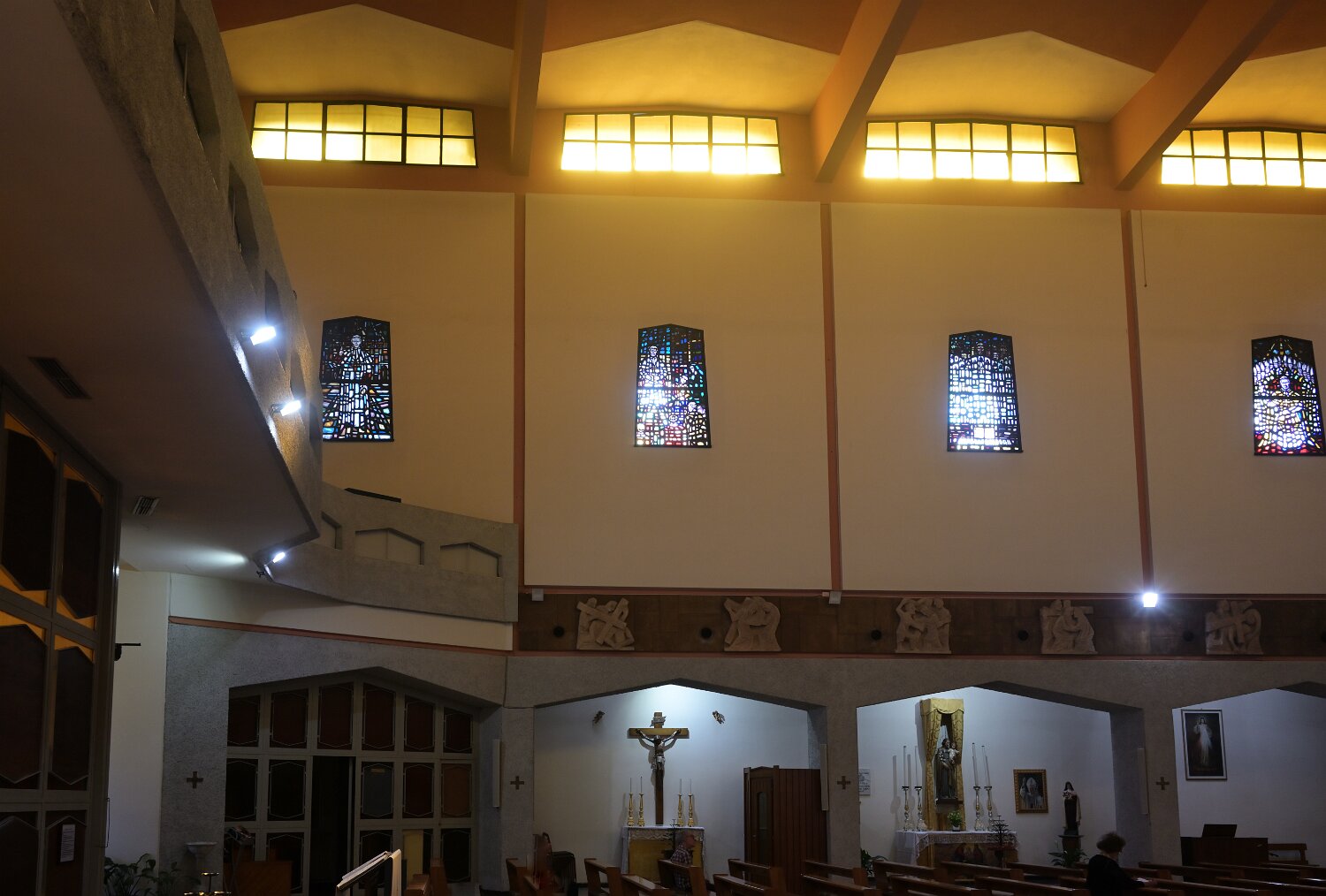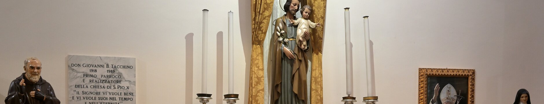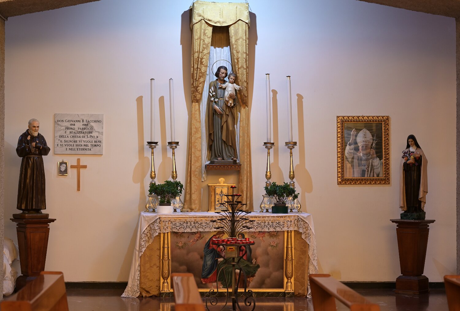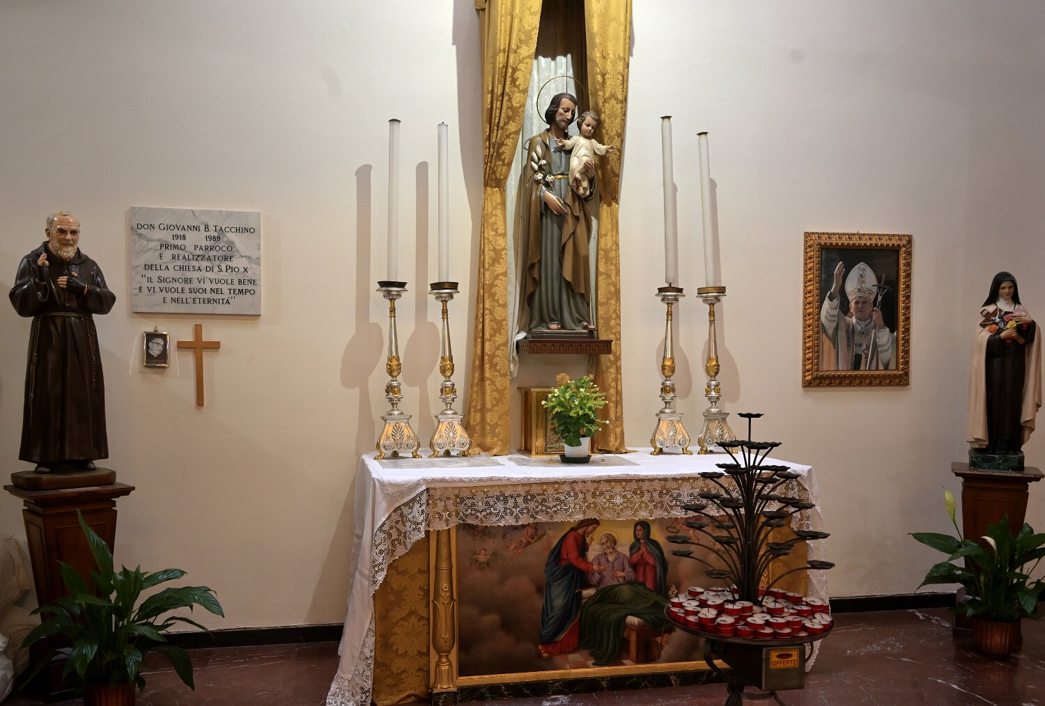 Parete sinistra Altare del Crocifisso presso l'ingresso Crocifisso presso l'ingresso San Giuseppe tra San Pio e Santa Teresina di Liseaux Altare di San Giuseppe Paliotto con il Transito di San Giuseppe Gesù Misericordioso Altare del Cuore Immacolato di Maria Statua del Cuore Immacolato di Maria Presbiterio