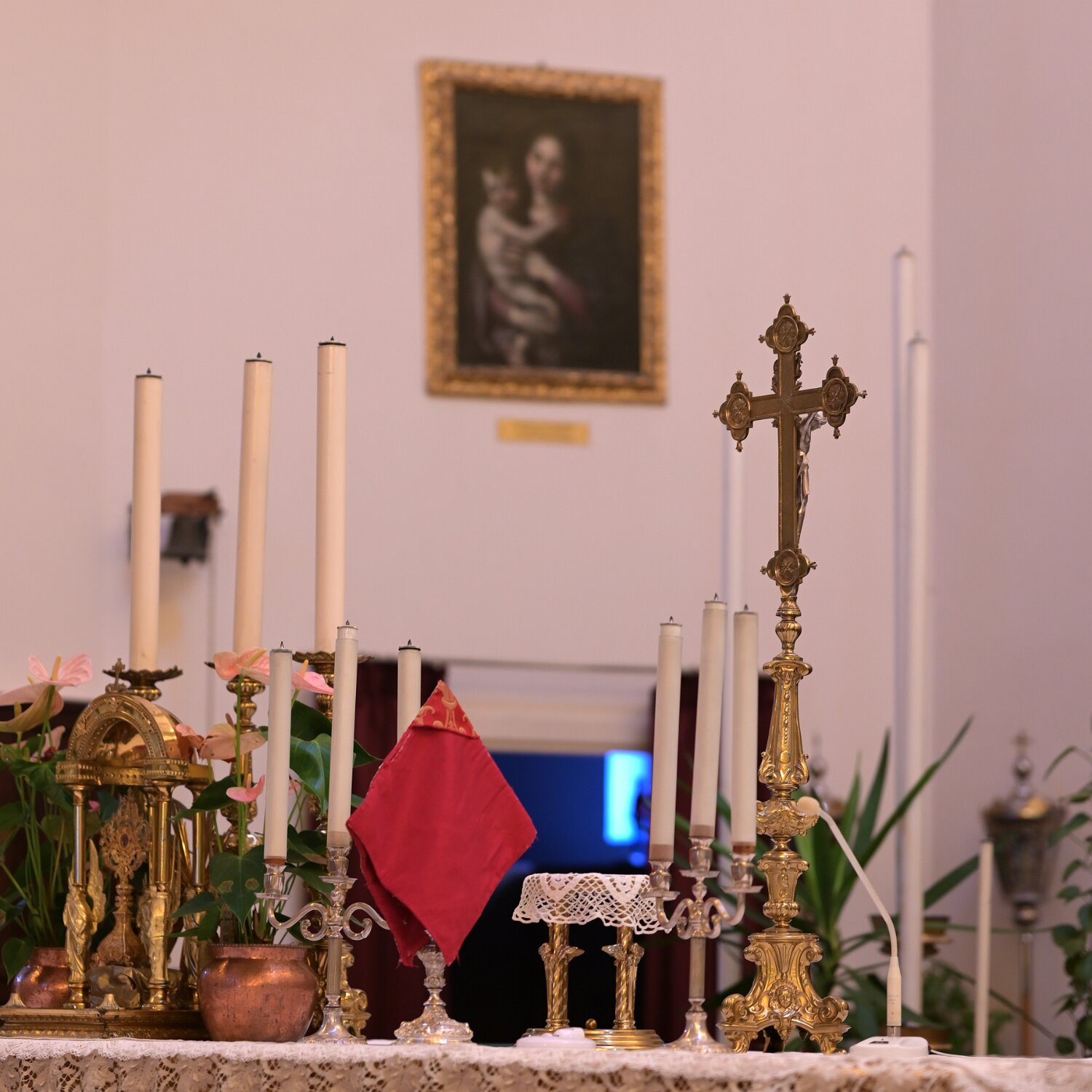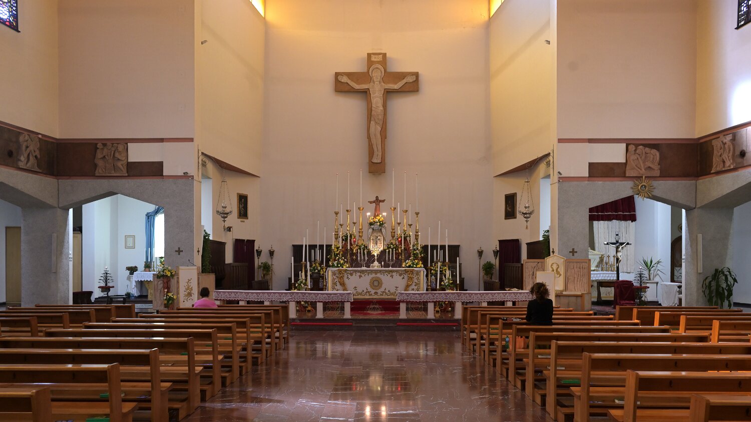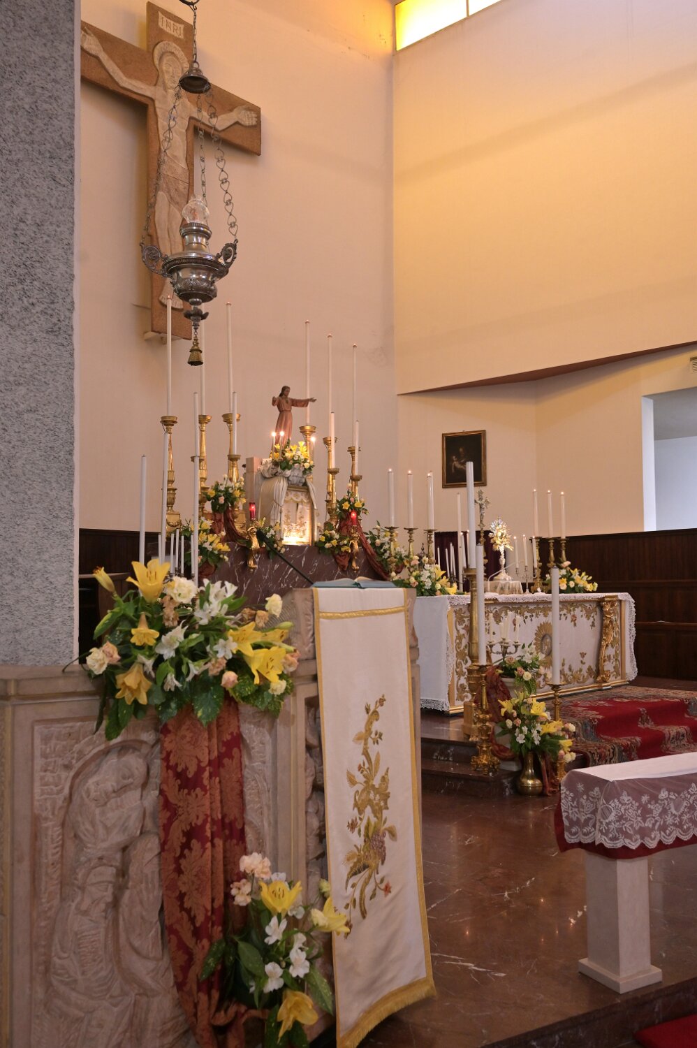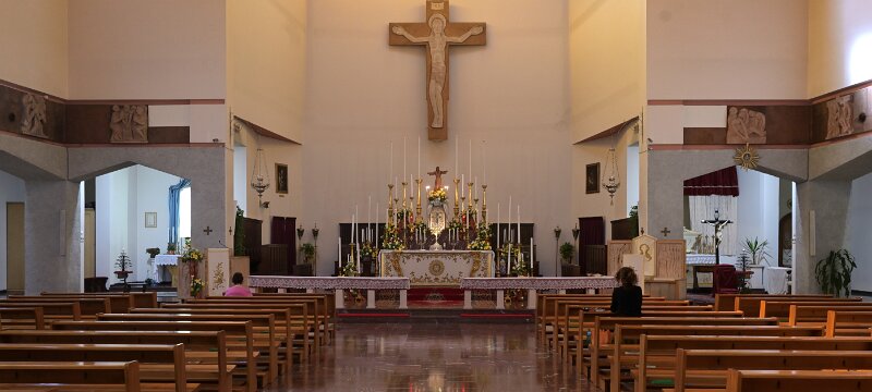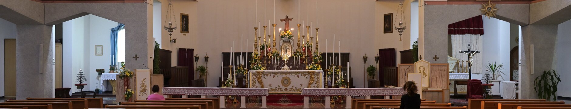 Navata unica con i due altari in testata ai lati del Presbiterio Grande Crocifisso in Presbiterio Madonna con Bambino (XVII sec.) San Giuseppe col Bambino (XVII sec.) Altare in Presiterio Ambone, Altare e Crocifisso Arcate di sinistraArcate di detra