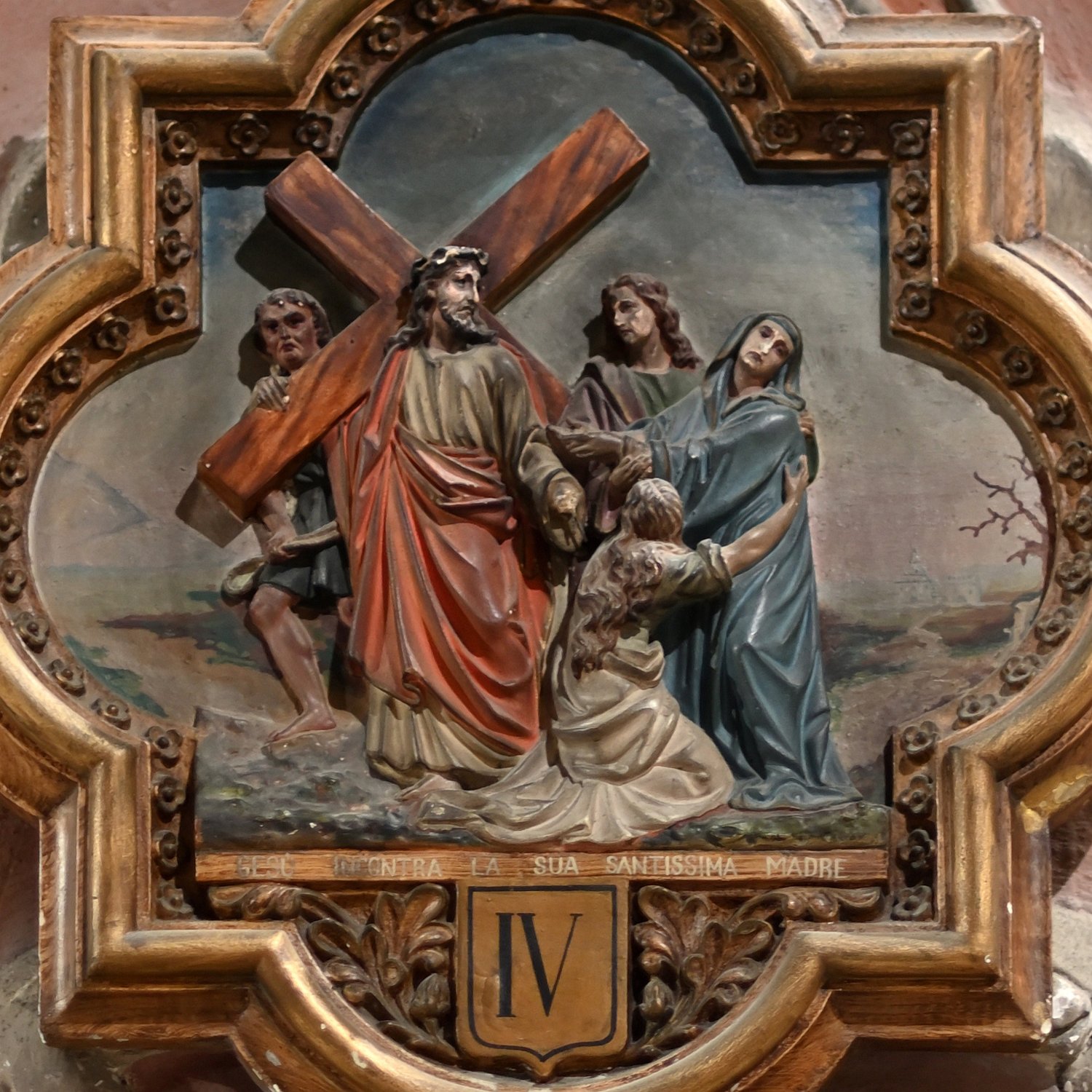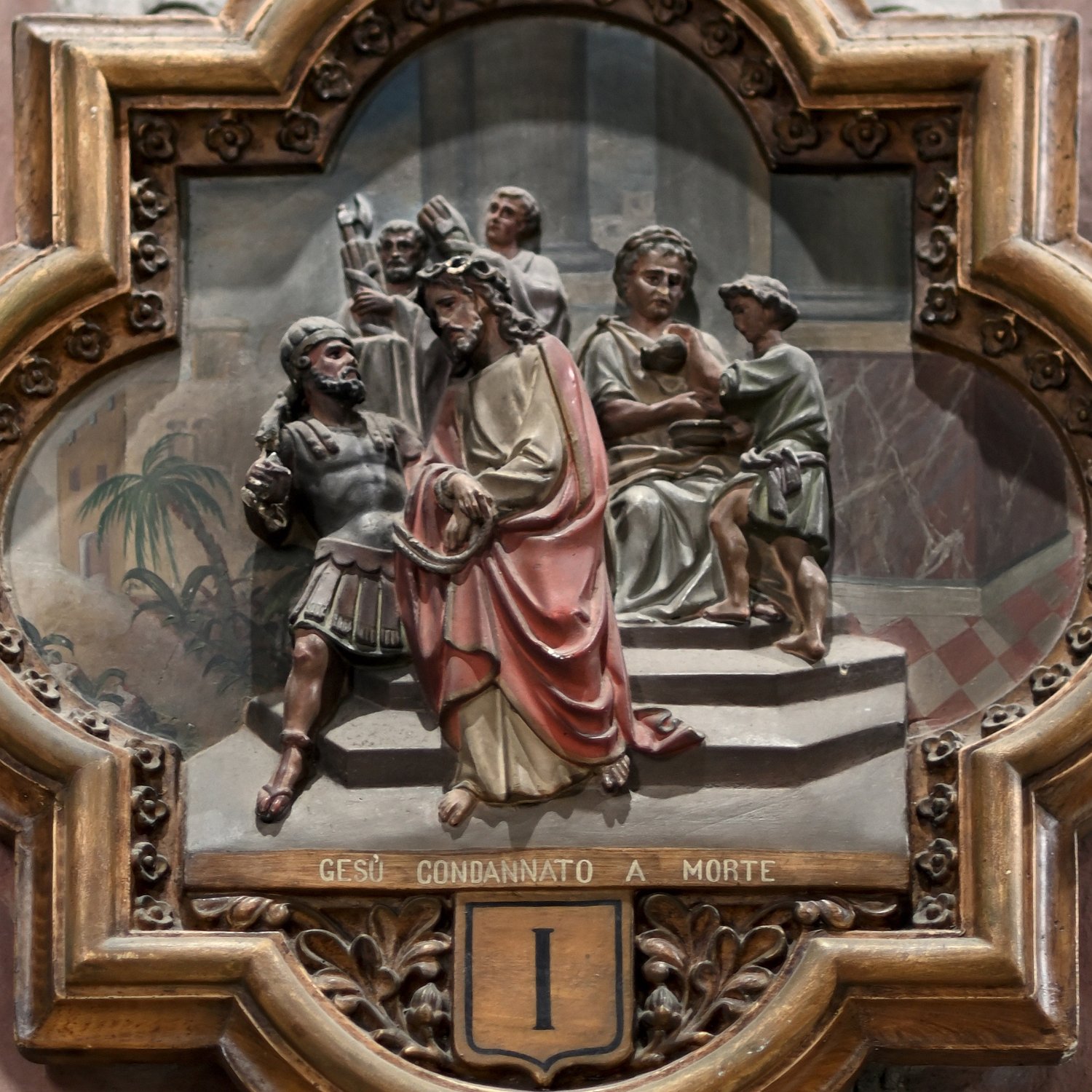 Statio I - Gesù è condannato a morte Statio II - Gesù è caricato della croce Statio III - Gesù cade per la prima volta Statio IV - Gesù incontra sua madre Statio V - Gesù è aiutato a portare la croce da Simone di Cirene Statio VI - Santa Veronica asciuga il volto di Gesù Statio VII - Santa Veronica asciuga il volto di Gesù Statio VIII - Gesù consola le donne di Gerusalemme Statio IX - Gesù cade per la terza volta Statio X - Gesù è spogliato delle vesti Statio XI - Gesù è inchiodato sulla croce Statio XII - Gesù muore in croce Statio XIII - Gesù è deposto dalla croce Statio XIV - Il corpo di Gesù è deposto nel sepolcro ControfacciataCappellina